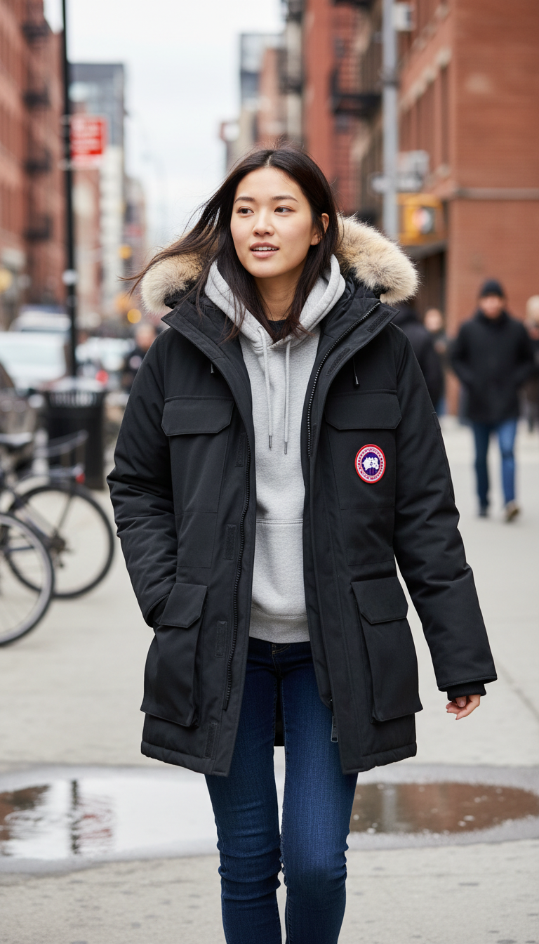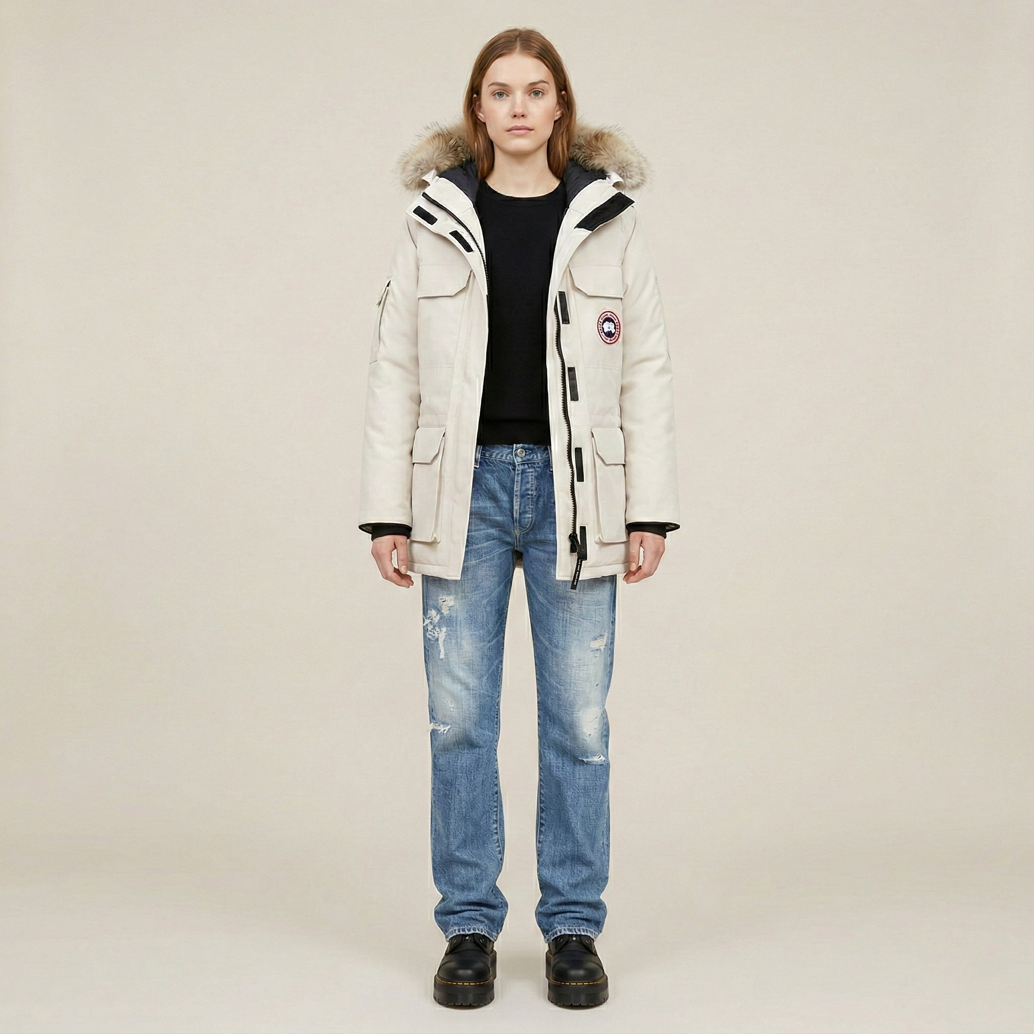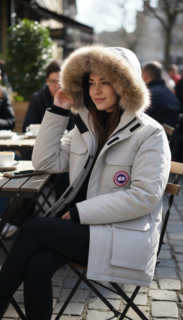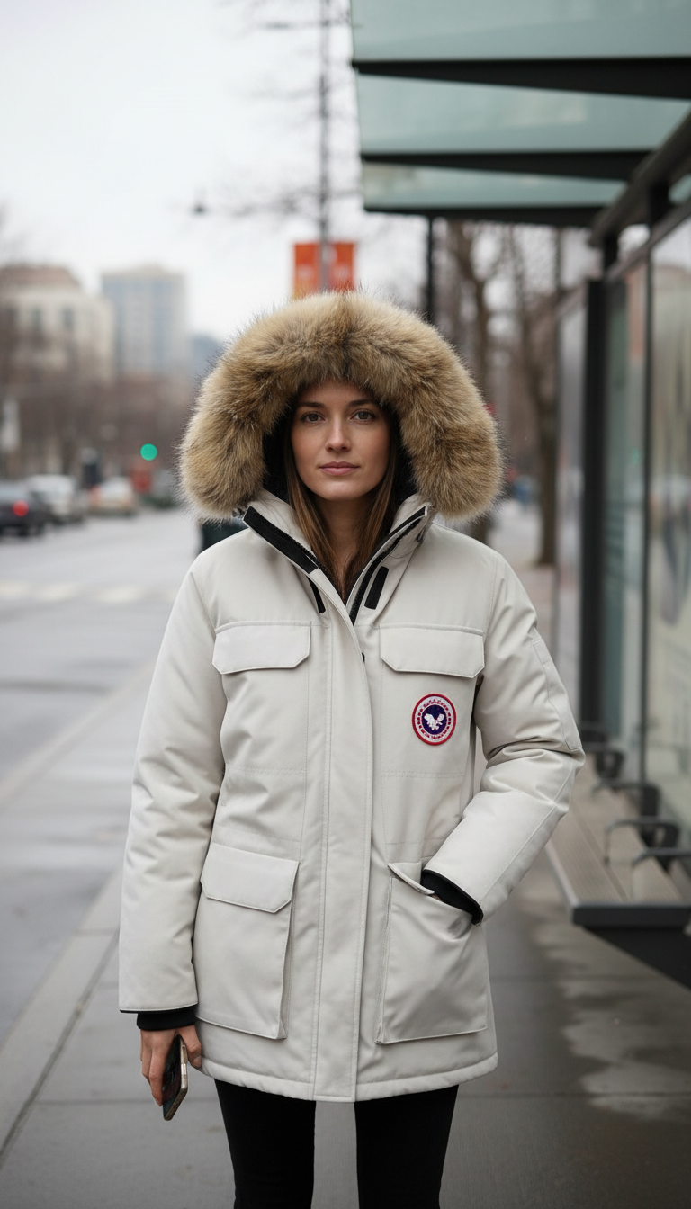 - Cappuccio con bordo in pelliccia per una maggiore protezione dal vento.
