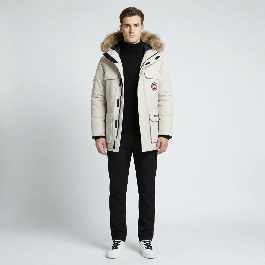Ten męski ocieplany parka został stworzony, aby pewnie i komfortowo stawić czoła zimnym dniom. Solidna konstrukcja i wewnętrzna izolacja termiczna pomagają utrzymać ciepło ciała nawet w surowych warunkach pogodowych, podczas gdy średnia długość zapewnia zrównoważoną ochronę bez ograniczania ruchów. Kaptur z futrzanym obszyciem dodaje dodatkową warstwę ochrony przed wiatrem, czyniąc ten model idealnym zarówno do codziennego użytku w mieście, jak i na aktywności na świeżym powietrzu. Funkcjonalne detale, takie jak pojemne kieszenie i elastyczne wykończenia, dopełniają praktyczny, a zarazem nowoczesny i dynamiczny design.