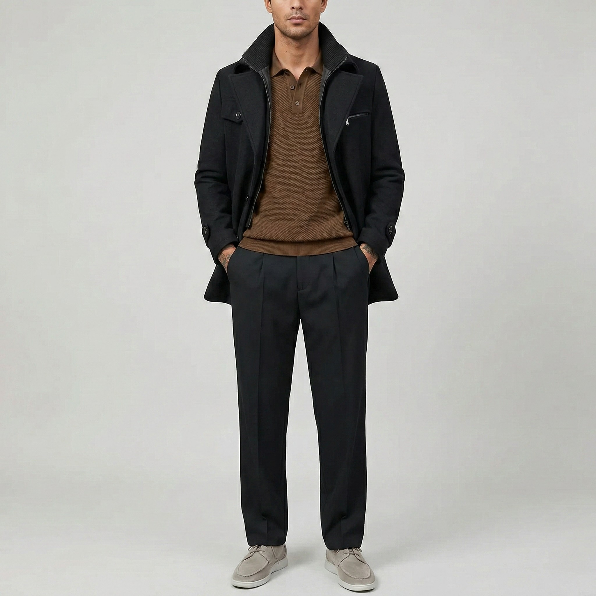 - Collo alto strutturato che ripara dal vento e valorizza la linea del cappotto.